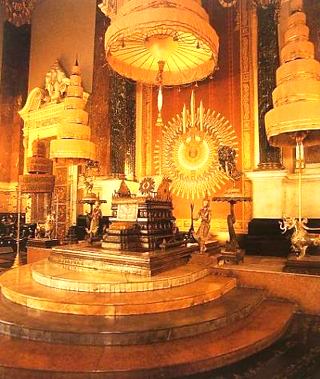 throne called Phuttanthom throne, made of wood covered with sillver and gold foil. A nine tiered white umbrella made for King Chulalongkorn stands over this throne. The emblem of the Chakri Dynasty is