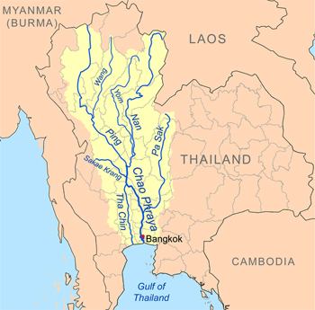 The Tha Chin river is a distributary of the Chao Phraya river, Thailand. It splits near the town Chainat and then flows westerly from the Chao Phraya through the central plain, until it mouths into the Gulf of Thailand at the town Samut Sakhon.