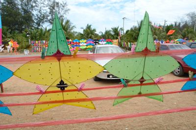 The kites used are called the chula (male) and the pak-pao (female). The chula is, of course, large, stronger and has a thicker string. It is star-shaped, measuring about five feet across. The pak-pao is much smaller, square, with a long tail. It has barbs to catch