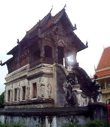 brilliantly carved and decorated panels at the front, glittering with coloured mirror chips and gilding. Behind this wiharn is a chedi, built by King Phraya Pa-Yu of Lanna Thai,