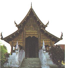 The Wiharn Lai Kham in Wat Phra Singh, Chiang Mai, is in the typical northern architectural style, with the roof extending like a bird's wings.
