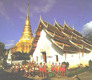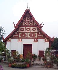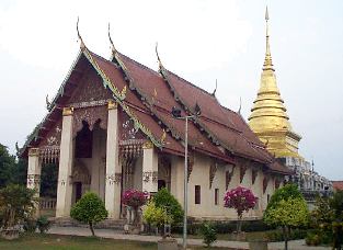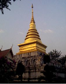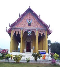 gold in the late afternoon sun. The Wiharn was also impressive, its multitiered roof showing the influence of nearby Laos. Visitors arrived constantly