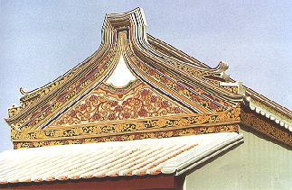 During the survey before the present remodelling, evidence was found of colored Chinese frescos painted on the gables all around the building. The desings had