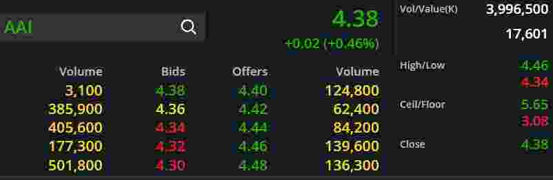 จากตารางที่ 1. หุ้น AAI เวลา 20.00 น. เช้าไปสั่งซื้อล่วงหน้าตามราคาใน Settrade Streaming for PC ที่ Volume มาก คือ 501,800 และ Bids น้อย ที่ 4.30 และ