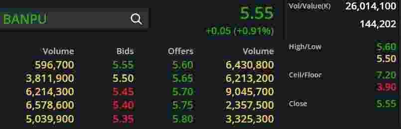 จากตารางที่ 2. หุ้น BANPU เวลา 20.00 น. เช้าไปสั่งซื้อล่วงหน้าตามราคาใน Settrade Streaming for PC ที่ Volume มาก คือ 6,578,600 และ Bids น้อย ที่ 5.40 และ