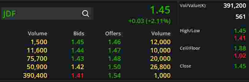จากตารางที่ 3. หุ้น JDF เวลา 20.00 น. เช้าไปสั่งซื้อล่วงหน้าตามราคาใน Settrade Streaming for PC ที่ Volume มาก คือ 390,400 และ Bids น้อย ที่ 1.41 และ