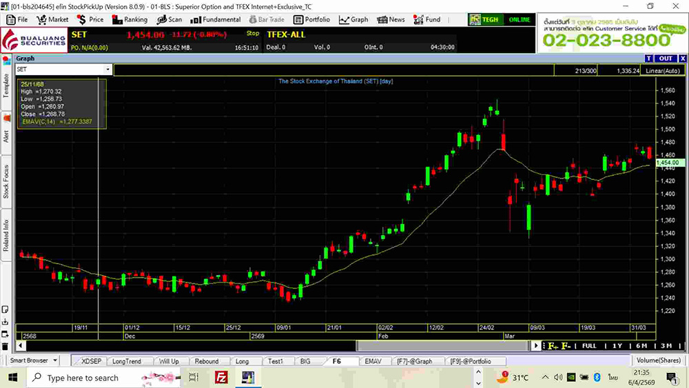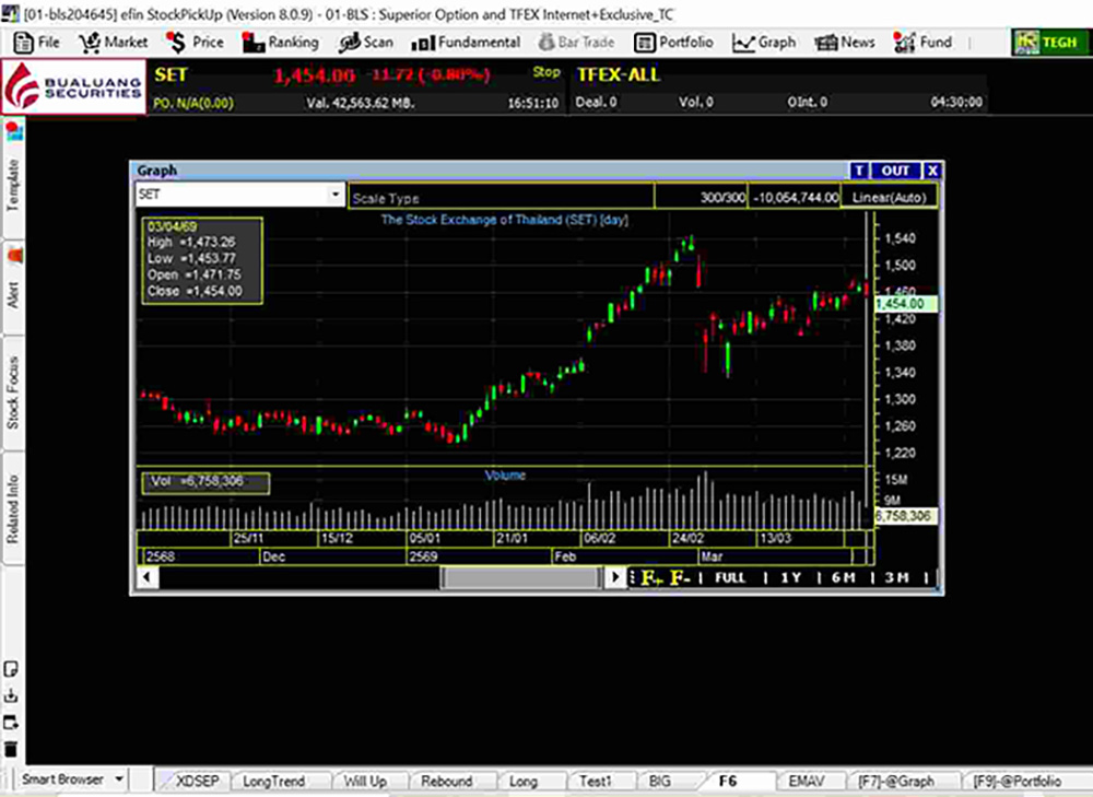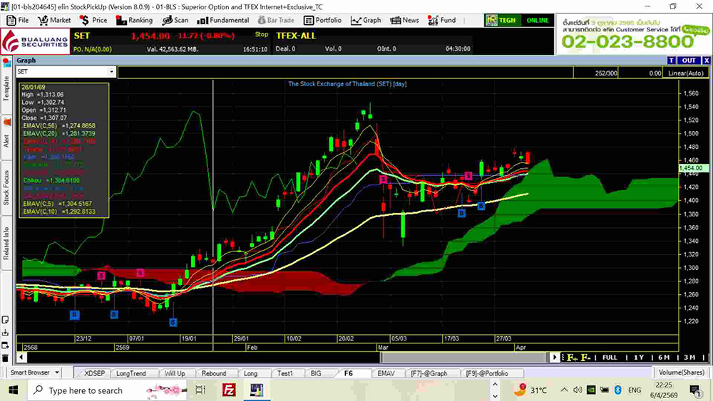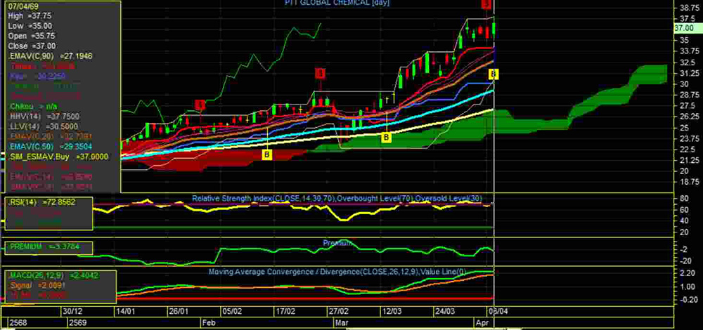 การใช้ efinStockPickUp เพื่อหาจุดซื้อขายหุ้นอย่างแม่นยำ เปืดโปรแกรม efinStockPickUp เลือกหัวข้อ Graft แถวบนอยู่กลางหน้าจอ คลิ๊กหัวข้อ Graft จะได้กราฟขึ้นมา ขยายภาพให้เต็มจอ Click ขวา ไปที่หัวข้อ Remove All Indicators เพื่อเอา Volume ออก Click ขวา ไปที่หัวข้อ Add Indicator in new Planel Click ขวา ไปที่หัวข้อ Add Indicator in new Planel Click ขวา ไปที่หัวข้อ Add Indicator in new Planel - Moving Average Indicator + Exponential Moving Average [.EMAV] จะได้เส้น EMAV ตามรูปข้่างล่าง จะได้เส้น EMAV Click ขวา ไปที่หัวข้อ Indicator Properties ใส่ตัวเลข 50 วัน ในช่อง Periods เปลี่ยนสีเส้น เป็นสีเหลือง Click ที่ช่อง Color เปลี่ยนขนาดเส้น จาก 1 เป็น 3 Click ที่ช่อง Line ใส่ตัวเลข 50 วัน ในช่อง Periods, เปลี่ยนสีเส้นที่ช่อง Color และ เปลี่ยนขนาดเส้น ที่ช่อง Line เพิ่มก้อนเมฆ Ichimoku Cloud Click ขวา ไปที่หัวข้อ Add Indicator in new Planel - Moving Average Indicator + Ichimoku Kinko Hyo [.ICHIMOKU] เพิ่มก้อนเมฆ Ichimoku Cloud ก้อนเมฆ Ichimoku Cloud เพิ่มจุดซื้อขาย Buy Sell หุ้นอย่างแม่นยำ Click ขวา ไปที่หัวข้อ Add Indicator in new Planel Simulate Indicators Simulate Exponential/Simple Moving Average [.SIM_EMAV] เพิ่มจุดซื้อขาย Buy Sell ใช้ Simulate Exponential/Simple Moving Average [.SIM_EMAV] หุ้นที่มีลักษณะน่าซื้อ ก้อนเมฆเขียวไต่ระดับสูงอย่างต่อเนื่อง หุ้นที่มีลักษณะที่ควรหนีห่าง ก้อนเมฆสีแดงไต่ระดับลงเหวอย่างต่อเนื่อง จากราคา 17.7 มาเหลือ 6.05 คำแนะนำที่เกี่ยวข้อง: คู่มือ efin StockPickUp สำหรับ การใช้งานบน Window PC คู่มือการติดตั้ง E-Fin Stock Pickup ส าหรับ Computer และ Laptop บน Browser Chrome efin StockPickUp โปรแกรมวิเคราะห์หุ้นที่มือใหม่ต้องรู้ การตั้งค่ากราฟ เบื้องต้นใน efin StockPickUp การใส่เส้นค่าเฉลี่ยหลายเส้นในกราฟ การใช้งาน Indicator Ichimoku วิธีใช้งาน Efin Stock Pickup เบื้องต้น ดูจบ ทำตามได้เลย ผู้พันโด่งกองทุนรวม
