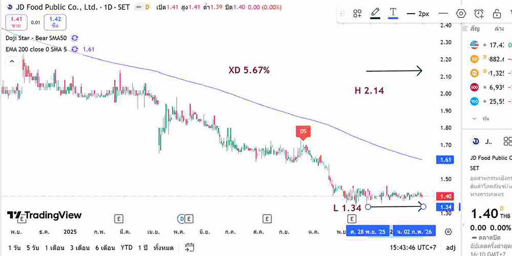 รูปที่ 1 หุ้น JDF บริษัท เจดีฟู้ด จำกัด (มหาชน) มีราคาต่ำสุดในรอบ 52 สัปดาห์ = 1.34 บาท มีราคาสูงสุดในรอบ 52 สัปดาห์ = 2.14 บาท อัตราตอบแทนเงินปันผล (% ต่อปี) = 5.71% มีเงินปันผลทั้งปี 0.08 บาท/หุ้น ถือว่ามากพอสมควร ราคาลงไปถึงแนวรับ 1.34 บาท ก็ยังไม่ขาดทุน