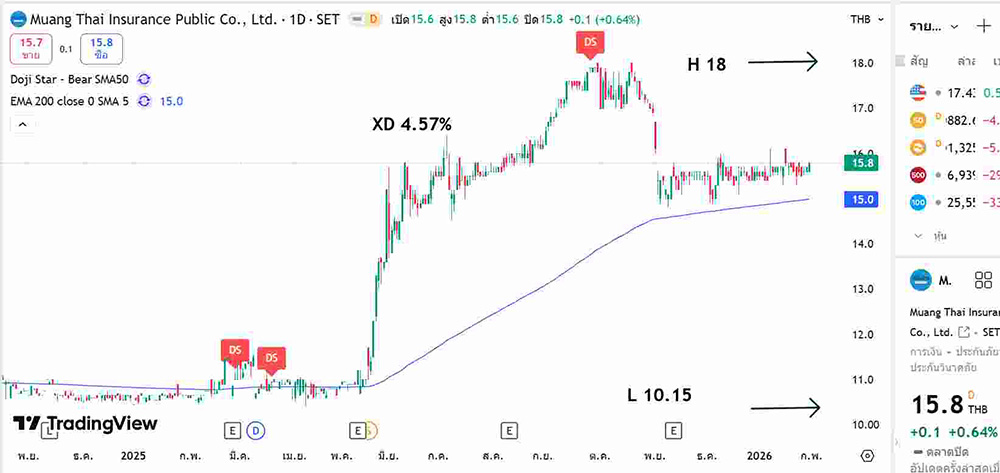 รูปที่ 2 หุ้น MTI บริษัท เมืองไทยประกันภัย จำกัด (มหาชน) มีราคาต่ำสุดในรอบ 52 สัปดาห์ = 10.40 บาท มีราคาสูงสุดในรอบ 52 สัปดาห์ = 18.00 บาท อัตราตอบแทนเงินปันผล (% ต่อปี) = 5.06% มีเงินปันผลทั้งปี 8.00 บาท/หุ้น ถือว่ามาก ราคาไม่ขึ้นไม่ลงหวือหวา กำลังไต่ระดับขี้นไปหาแนวต้าน