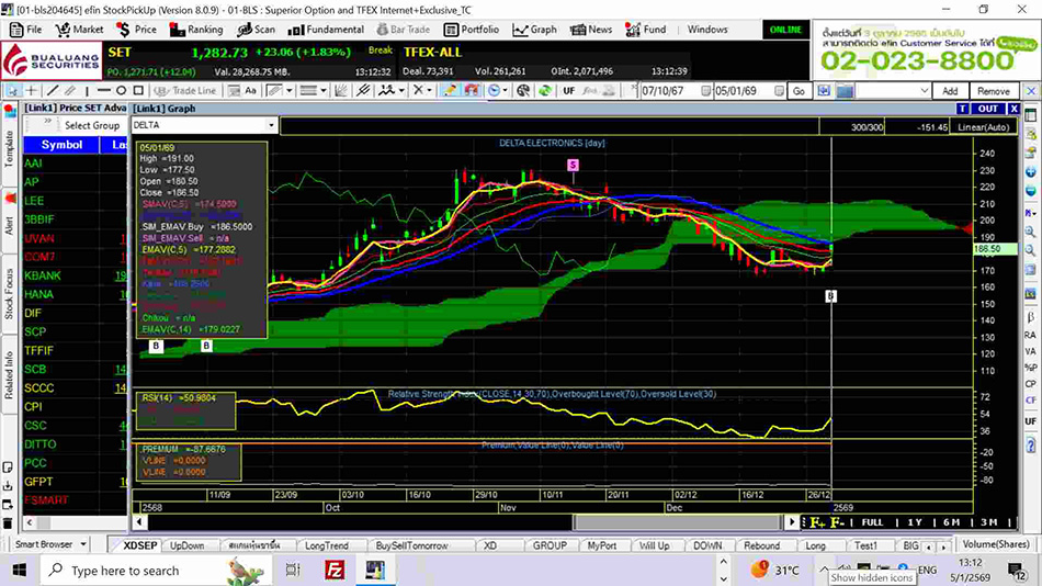 ในรูปที่ 10.4 หุ้น DELTA อยู่เหนือก้อนเมฆ Ichimoku Cloud สีเขียว และมีสัญาณซื้อ