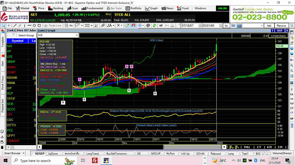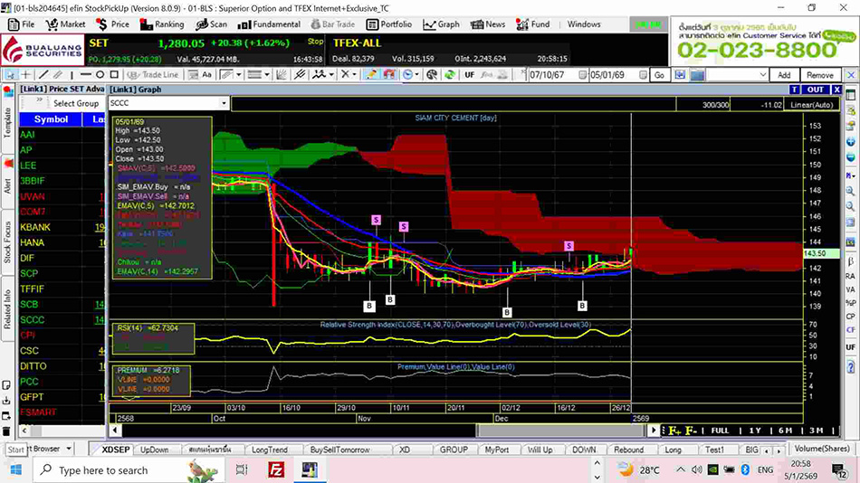 ในรูปที่ 10.5 หุ้น SCB อยู่เหนือก้อนเมฆ Ichimoku Cloud สีเขียว และมีสัญาณซื้อ
