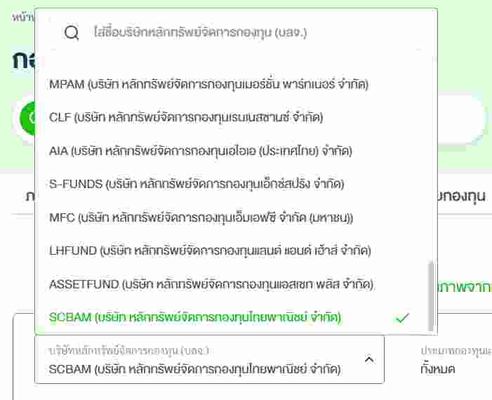 ในกรอบซ้ายมือด้านบน ให้เลือก SCBAM (บริษัท หลีกทรัพย์จัดการกองทุนไทยพาณิชย์ จำกัด) ท่านจะเลือกบริษัทหลักทรัพย์จัดการกองทุน (บลจ.) อะไรก็ได้ ตามที่ท่านใช้บริการโบ๊กเกอร์